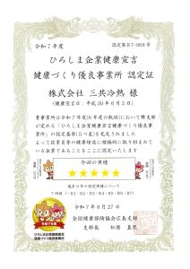 令和7年度「ひろしま企業健康宣言 健康づくり優良事業所」に認定されました。